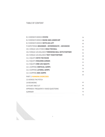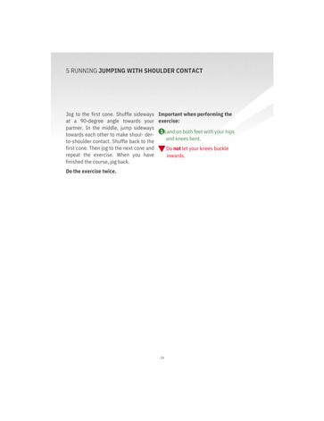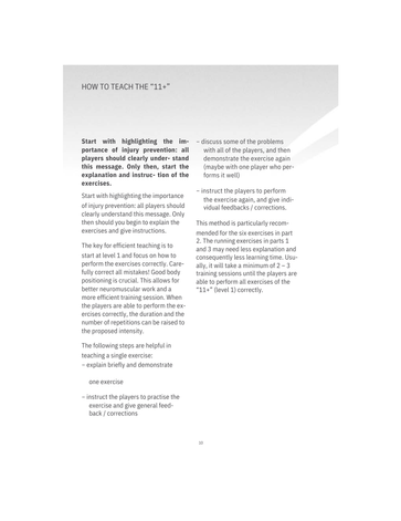 The program takes twenty minutes to complete and is designed to be performed twice a week. No specific equipment is needed. The FIFA 11+ consists of 15 exercises divided into three separate components.
