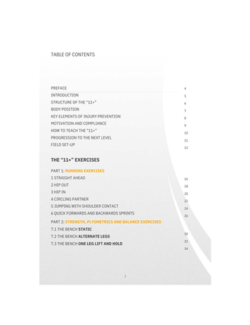 The FIFA 11+ is an injury-prevention program which has been specifically designed to prevent soccer injuries. It was developed by a panel of international experts to build on earlier injury-prevention efforts, including the PEP program and FIFA 11.